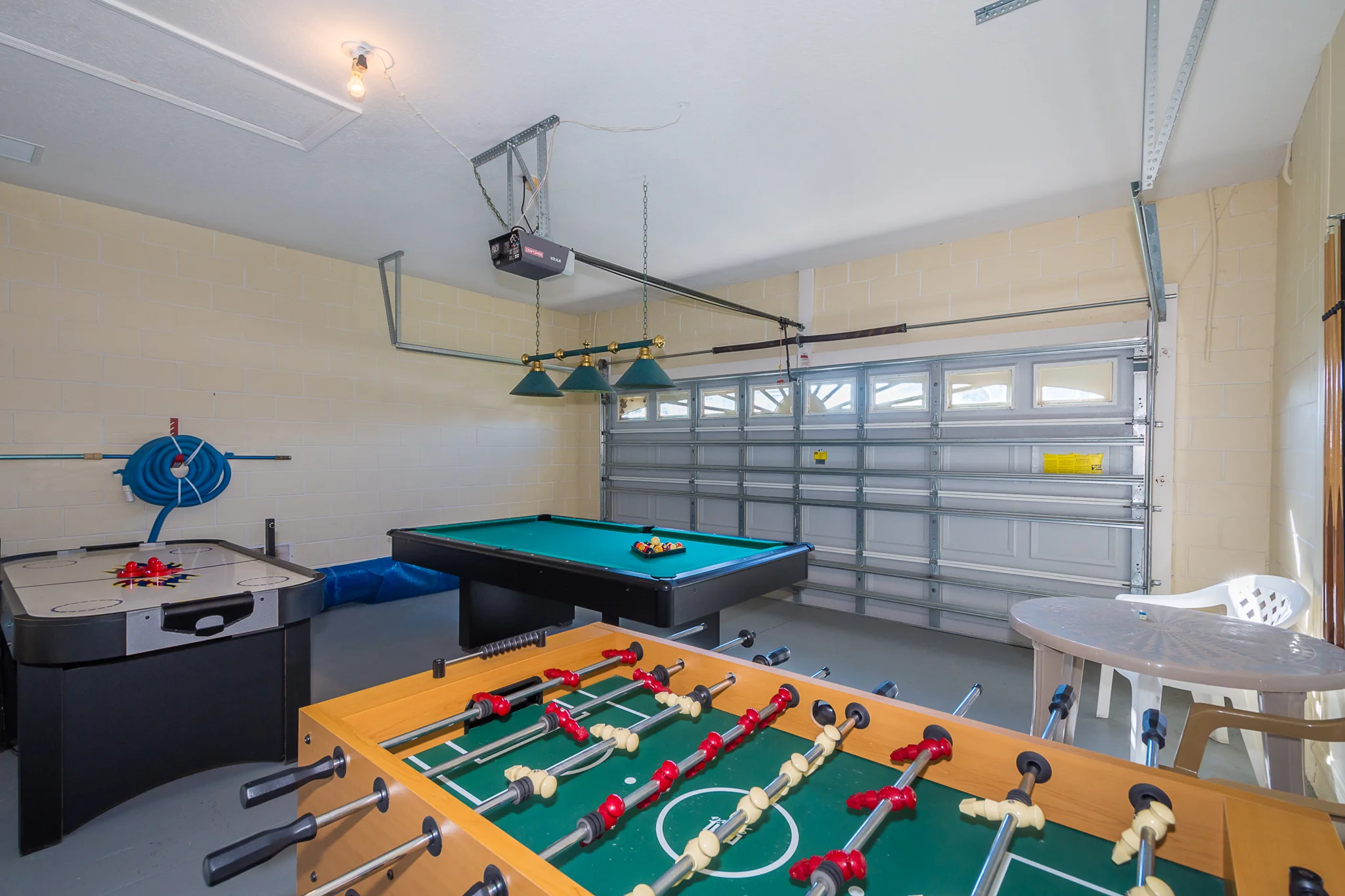 Screen enclosed lanai poolside with covered outdoor dining furniture